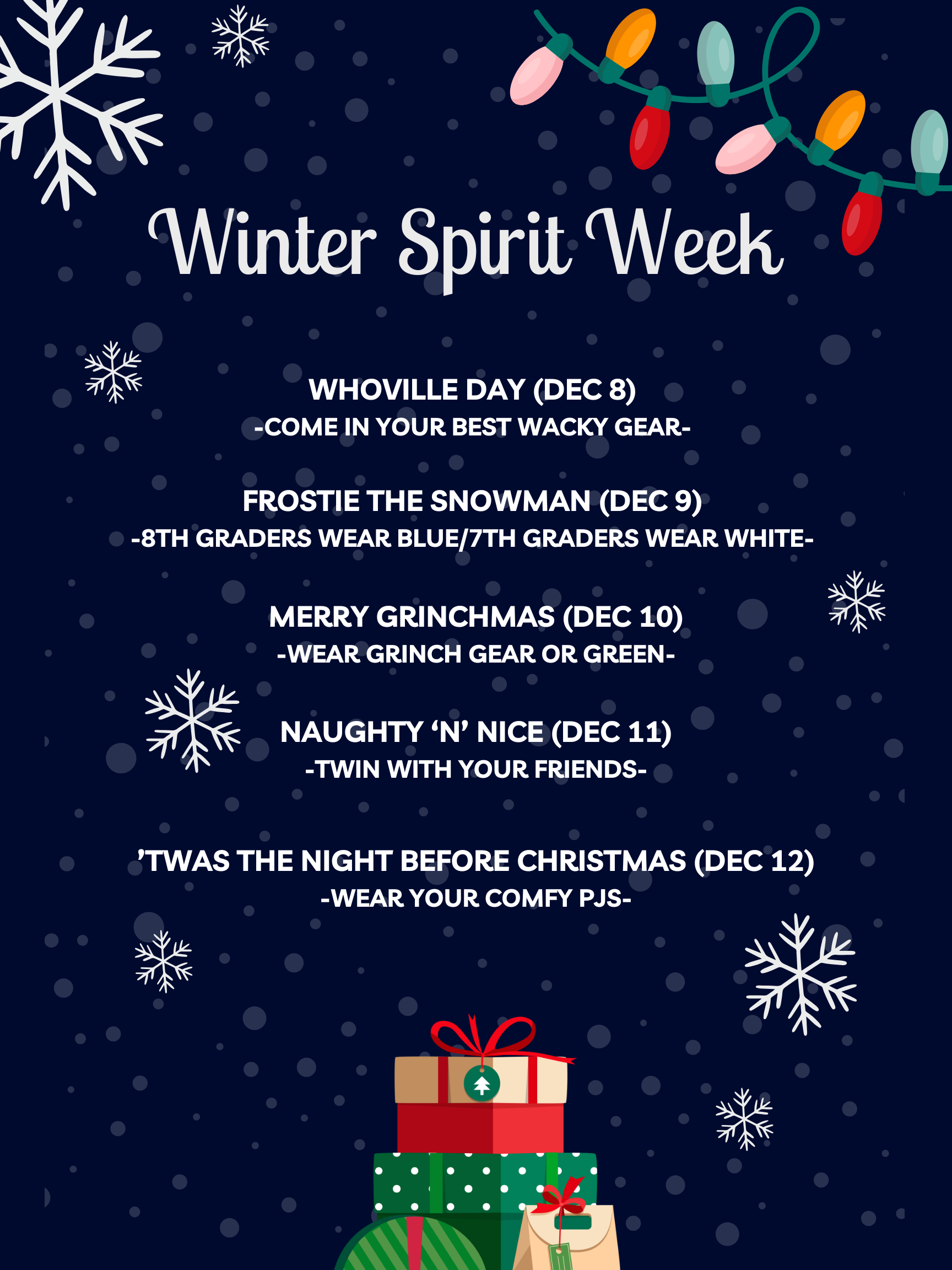 - Dec 8: Whoville Day (Come in your wackiest gear!)